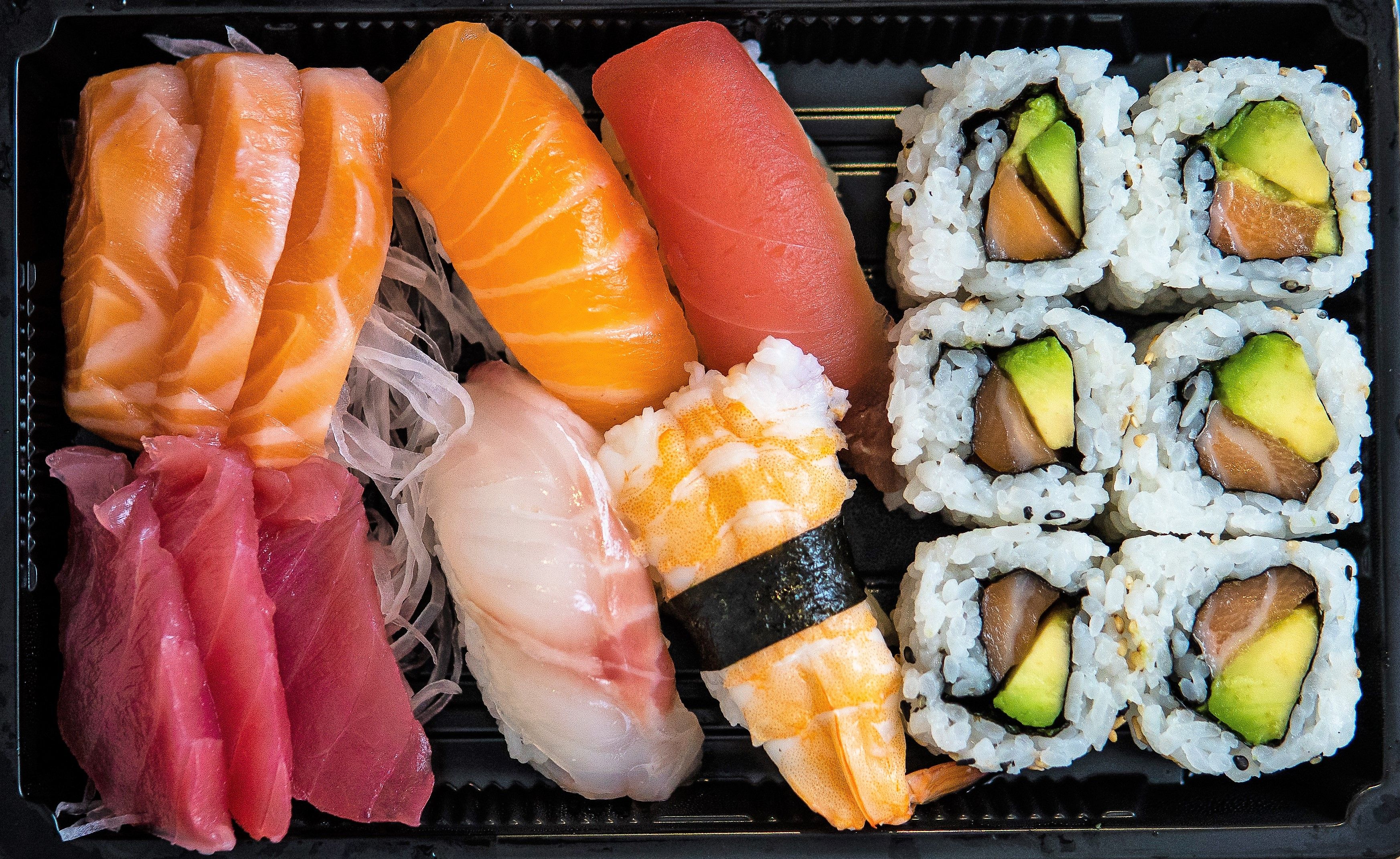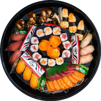 3 Salmon Sashimi, 3 Tuna Sashimi, 6 Avocado Hosomaki, 6 Cucumber Hosomaki, 6 Salmon Hosomaki, 6 Tuna Hosomaki, 8 Spicy California Uramaki, 8 Spicy Salmon Crunchy Roll, 8 Crispy Duck Roll, 8 Crunchy Prawn Roll